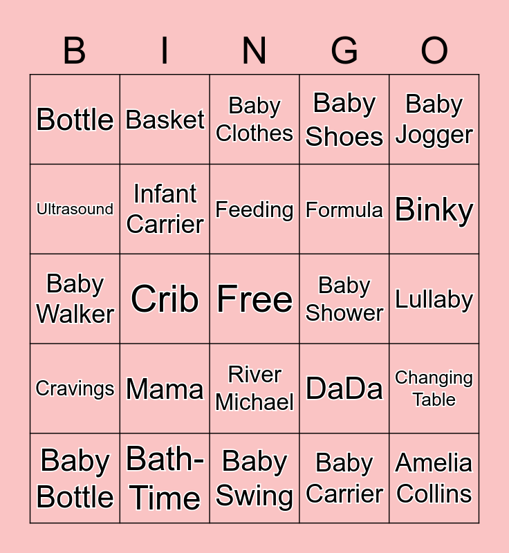This bingo card has a free space and 44 words: Registry, Amelia Collins, Baby Bath, Baby Bottle, Fox Family, Baby Carrier, Baby Clothes, Baby Food, Baby Jogger, Bath-Time, Baby Shoes, Baby Shower, River Michael, Mama, Baby Sitter, Baby Swing, Baby Toy, Baby Walker, Baby Wear, Binky, Basket, Lana Mary-Ellen, Bassinet, Bottle, Mobile, Lullaby, Bibs, Booties, DaDa, Cravings, Car Seat, Changing Table, Cloth Diaper, Cradle, Crib, Diapers, Diaper Bag, Blanket, Feeding, Ultrasound, Formula, High Chair, Infant Carrier and Stroller.
