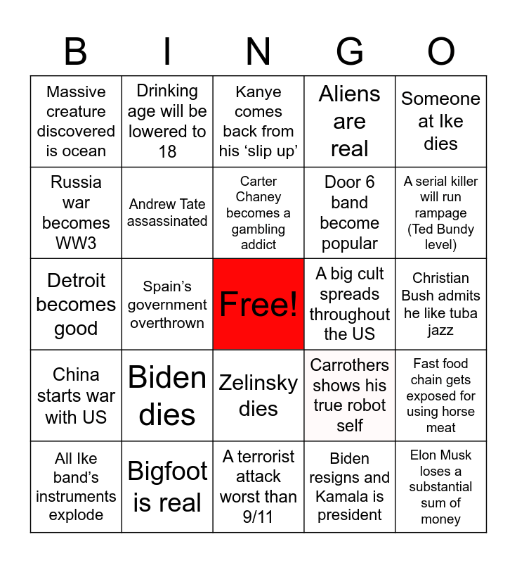 This bingo card has a free space and 24 words: Biden dies, Bigfoot is real, Carter Chaney becomes a gambling addict, All Ike band’s instruments explode, Someone at Ike dies, Massive creature discovered is ocean, Russia war becomes WW3, Drinking age will be lowered to 18, A big cult spreads throughout the US, Zelinsky dies, Door 6 band become popular, Detroit becomes good, Carrothers shows his true robot self, Fast food chain gets exposed for using horse meat, Andrew Tate assassinated, Biden resigns and Kamala is president, Christian Bush admits he like tuba jazz, Kanye comes back from his ‘slip up’, A serial killer will run rampage (Ted Bundy level), Spain’s government overthrown, Elon Musk loses a substantial sum of money, China starts war with US, Aliens are real and A terrorist attack worst than 9/11.