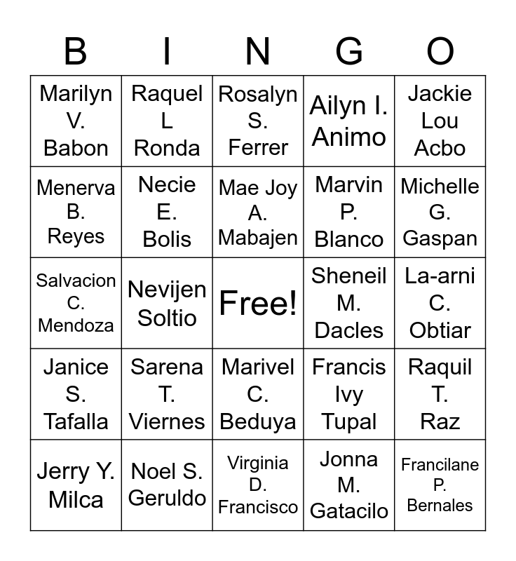This bingo card has a free space and 26 words: Marivel C. Beduya, Jonna M. Gatacilo, Mae Joy A. Mabajen, Noel S. Geruldo, Jackie Lou Acbo, Marilyn V. Babon, Menerva B. Reyes, Raquel L Ronda, La-arni C. Obtiar, Francis Ivy Tupal, Marvin P. Blanco, Salvacion C. Mendoza, Raquil T. Raz, Jerry Y. Milca, Nevijen Soltio, Janita D. Caber, Ailyn I. Animo, Janice S. Tafalla, Rosalyn S. Ferrer, Francilane P. Bernales, Michelle G. Gaspan, Virginia D. Francisco, Sheneil M. Dacles, Sarena T. Viernes, Necie E. Bolis and Ma. Lanilyn D. Laoyon.