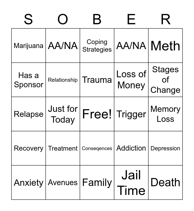 This bingo card has a free space and 24 words: Treatment, Avenues, Trauma, Anxiety, Meth, Marijuana, Has a Sponsor, AA/NA, Trigger, Conseqences, Loss of Money, Relapse, Addiction, Depression, Relationship, Jail Time, Memory Loss, Coping Strategies, Stages of Change, Just for Today, Death, Recovery, AA/NA and Family.
