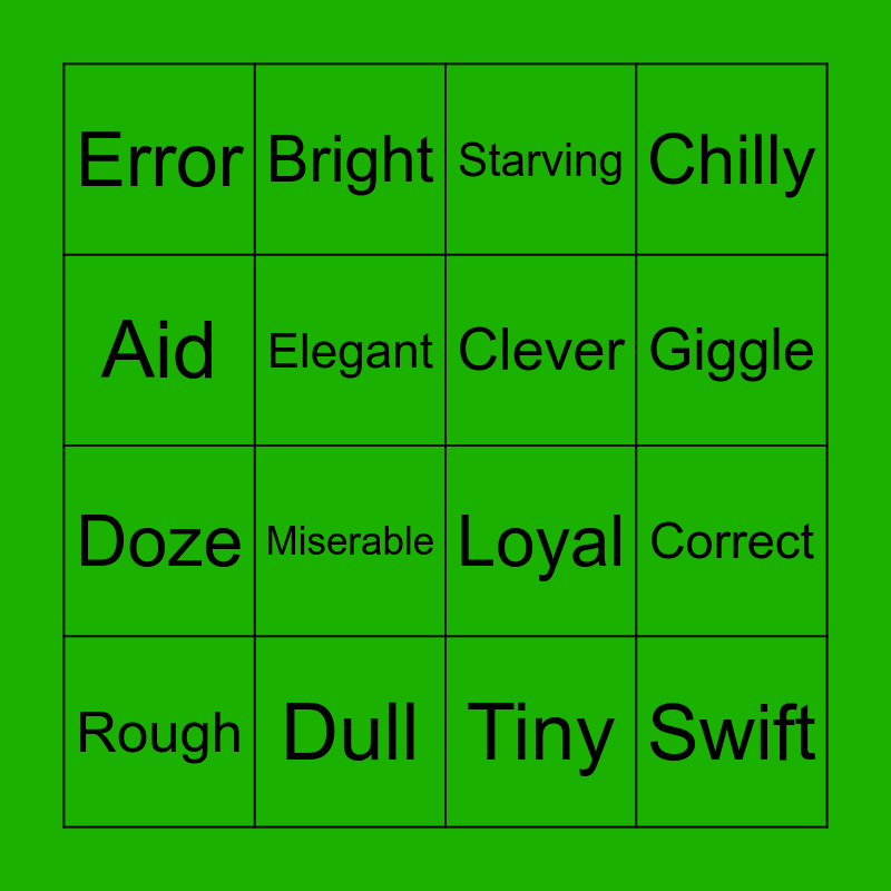 This bingo card has 16 words: Dull, Correct, Starving, Error, Doze, Bright, Loyal, Tiny, Aid, Elegant, Rough, Chilly, Miserable, Giggle, Clever and Swift.