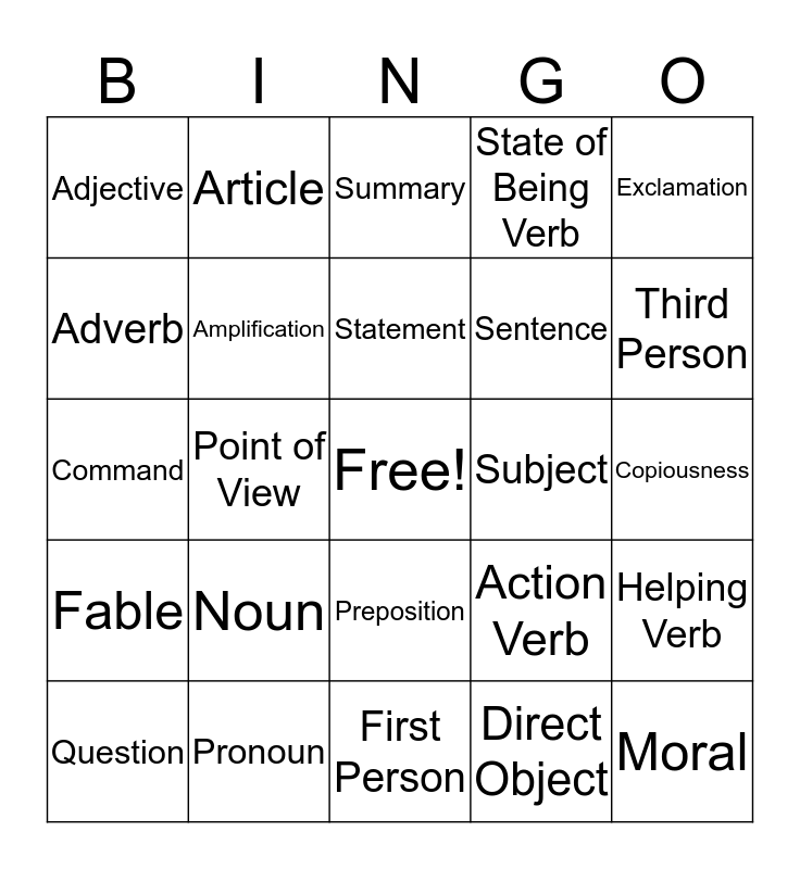 This bingo card has a free space and 24 words: Noun, Pronoun, Statement, Question, Exclamation, Adjective, Adverb, Article, Subject, Preposition, Sentence, Command, Action Verb, Helping Verb, Amplification, Direct Object, Copiousness, Summary, Third Person, Point of View, Moral, Fable, State of Being Verb and First Person.