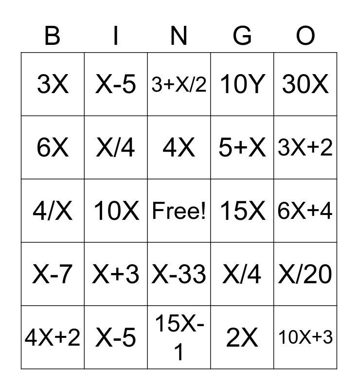 This bingo card has a free space and 24 words: X+3, X-5, 4X, 4X+2, 30X, 3X, 6X, X-5, 15X, X-33, 5+X, 4/X, X/4, X/20, X/4, 2X, 6X+4, 3+X/2, 3X+2, 10X, 10X+3, X-7, 10Y and 15X-1.