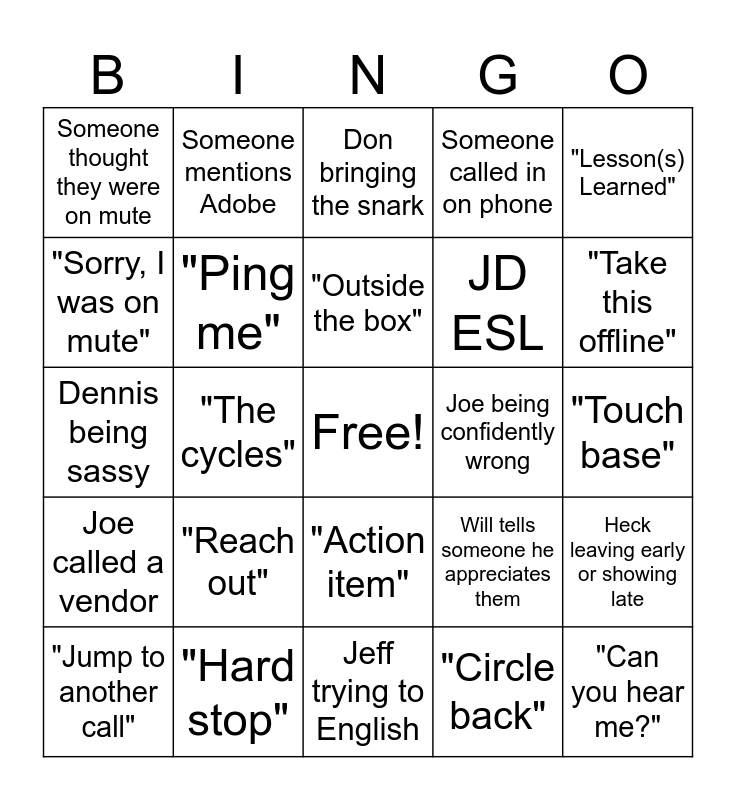 This bingo card has a free space and 27 words: Will tells someone he appreciates them, Heck not there, JD ESL, Jeff trying to English, "Sorry, I was on mute", Don bringing the snark, Someone mentions Adobe, Joe called a vendor, Joe being confidently wrong, Heck leaving early or showing late, Dennis being sassy, Someone called in on phone, "Jump to another call", "Hard stop", "Take this offline", "Can everyone see my screen?", "Ping me", "Outside the box", "Reach out", Someone thought they were on mute, "Touch base", "Circle back", "The cycles", "Can you hear me?", "Action item", "Lesson(s) Learned" and Someone makes fun of JD.