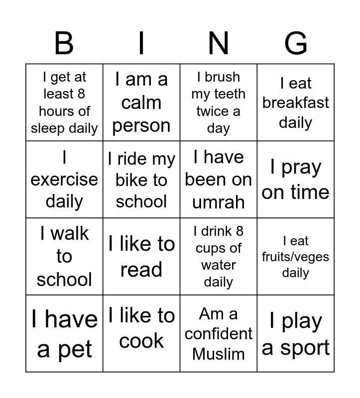 This bingo card has 16 words: I like to cook, I eat fruits/veges daily, I brush my teeth twice a day, I get at least 8 hours of sleep daily, I walk to school, I am a calm person, I drink 8 cups of water daily, Am a confident Muslim, I exercise daily, I ride my bike to school, I have a pet, I eat breakfast daily, I like to read, I pray on time, I have been on umrah and I play a sport.