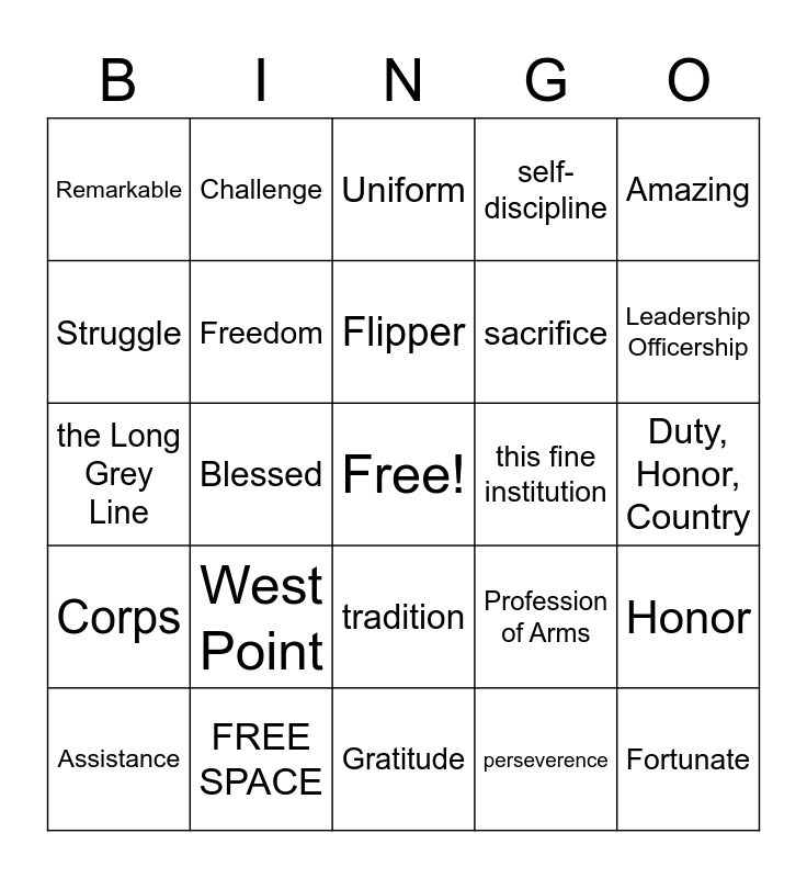 This bingo card has a free space and 25 words: West Point, Gratitude, Flipper, Assistance, Amazing, Remarkable, Struggle, Challenge, this fine institution, tradition, sacrifice, the Long Grey Line, Profession of Arms, Honor, Freedom, No substitute for victory, Duty, Honor, Country, Uniform, Leadership Officership, Blessed, Fortunate, FREE SPACE, Corps, self-discipline and perseverence.
