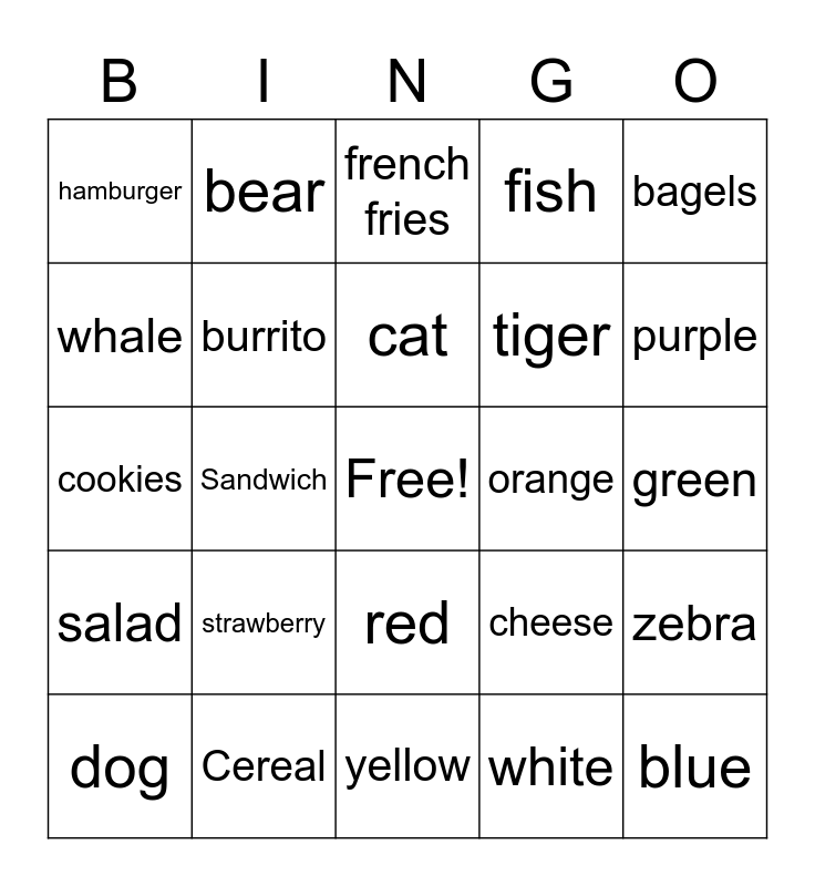 This bingo card has a free space and 30 words: Cereal, Food, Sandwich, steak, hamburger, french fries, burrito, red, orange, yellow, green, blue, white, black, purple, pink, cheese, salad, strawberry, bagels, cookies, lion, bear, tiger, whale, fish, zebra, dog, cat and bear.