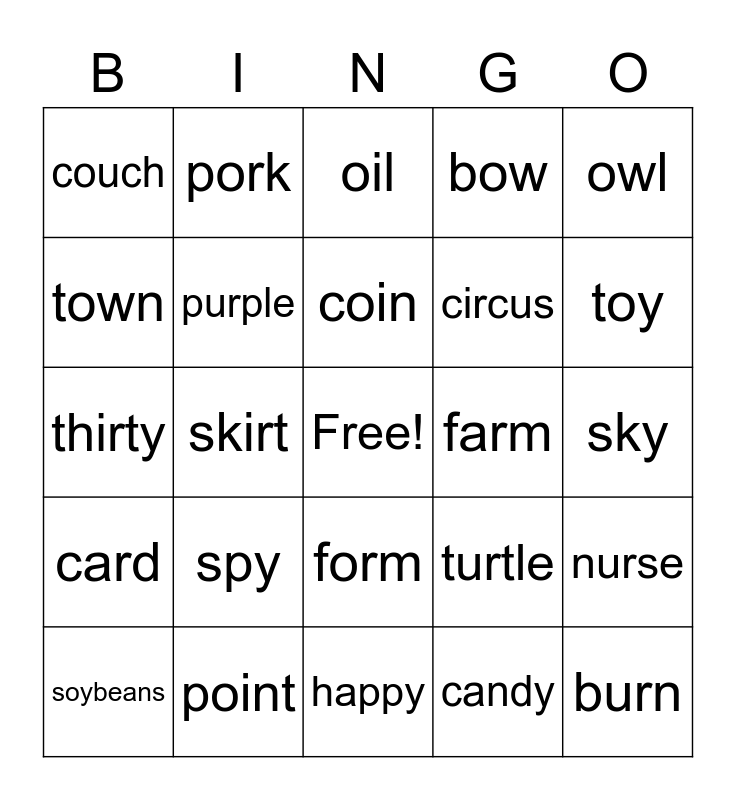 This bingo card has a free space and 24 words: spy, point, coin, soybeans, owl, couch, town, pork, farm, form, circus, thirty, turtle, nurse, purple, candy, sky, oil, toy, skirt, burn, card, bow and happy.