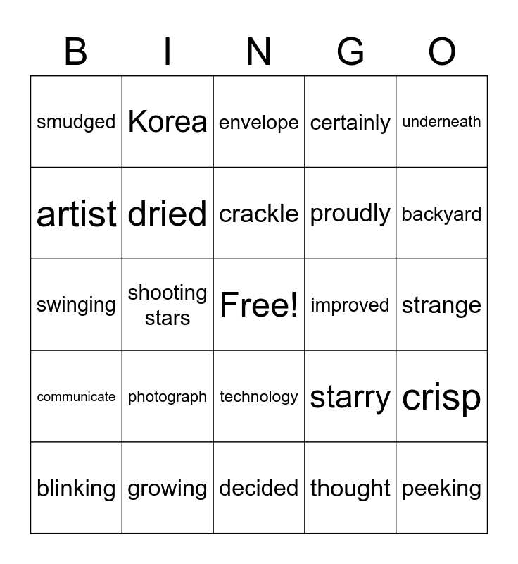 This bingo card has a free space and 29 words: blinking, soared, shooting stars, persimmon, smudged, envelope, dried, photograph, improved, growing, strange, peeking, decided, thought, backyard, answered, technology, communicate, underneath, swinging, starry, announced, proudly, artist, certainly, Korea, crisp, crackle and golden.