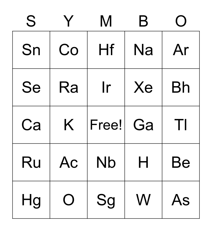 This bingo card has a free space and 49 words: Sn, As, F, Sg, Ac, Os, Co, Ag, Se, Po, Ra, Na, Be, H, Ni, Li, Ir, Ga, Ne, Ar, K, W, Sn, Xe, He, Bh, Hg, Fr, Nb, Ru, Pt, C, Zn, N, O, P, Fr, Rg, Tl, Bi, Og, Ds, Fe, Y, Ca, Hf, Sr, As and Kr.