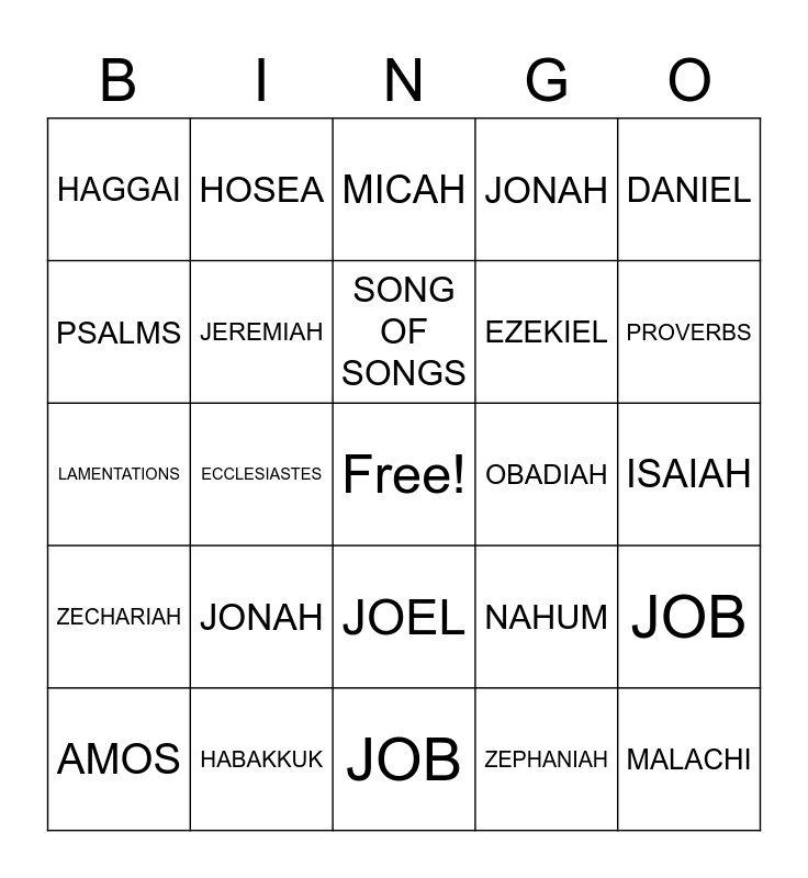 This bingo card has a free space and 24 words: JONAH, HABAKKUK, SONG OF SONGS, AMOS, DANIEL, HAGGAI, PSALMS, HOSEA, OBADIAH, JOEL, EZEKIEL, LAMENTATIONS, NAHUM, JOB, JEREMIAH, ZEPHANIAH, ISAIAH, MICAH, PROVERBS, ECCLESIASTES, MALACHI, ZECHARIAH, JONAH and JOB.