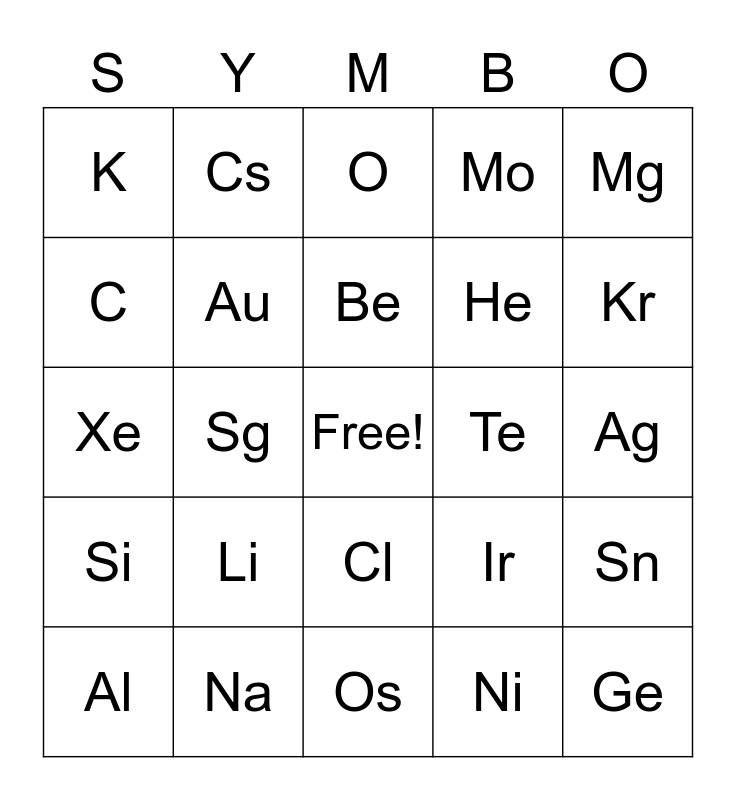 This bingo card has a free space and 24 words: Al, Li, Be, Ni, Mg, K, Cs, O, Te, Ag, Xe, Au, Ir, Sn, C, Na, Os, Mo, Kr, Si, Sg, Cl, He and Ge.