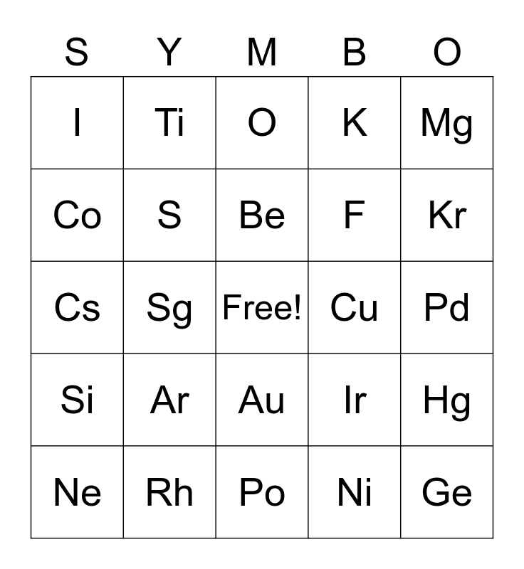 This bingo card has a free space and 24 words: Ne, Ar, Be, Ni, Mg, I, Ti, O, Cu, Pd, Cs, S, Ir, Hg, Co, Rh, Po, K, Kr, Si, Sg, Au, F and Ge.