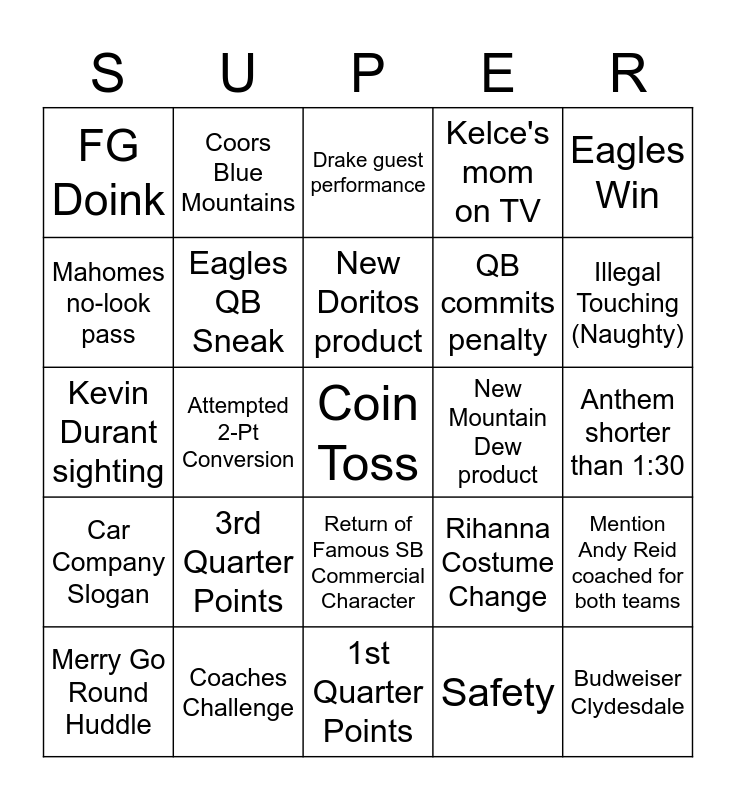This bingo card has a free space and 48 words: Dog in a Commercial, Budweiser Clydesdale, Busch Spelt with Multiple S's, 1st Quarter Points, 3rd Quarter Points, Mention of Tom Brady's Retirement, Coors Blue Mountains, Electric Vehicle Ad, Mahomes no-look pass, Eagles 4th Down Conversion, Eagles QB Sneak, Kelce's mom on TV, Mention Andy Reid coached for both teams, Rihanna Costume Change, Winning Gatorade Blue/Purple/Green, Winning Gatorade Orange/Red/Yellow, New Doritos product, New Mountain Dew product, Chiefs Win, Eagles Win, Attempted 2-Pt Conversion, Safety, FG Doink, QB commits penalty, Free Kick Out of Bounds, Illegal Touching (Naughty), Merry Go Round Huddle, Old Spice Commercial, Return of Famous SB Commercial Character, Car Company Slogan, Kanye West, Donald Trump, "You Stupid Idiot" - DC, Gordon Ramsay, Coaches Challenge, Review initiated by the booth, Anthem longer than 1:30, Anthem shorter than 1:30, Shot of flyover, Rihanna Enters/Exits via roof, Rihanna performs 'Umbrella' with an umbrella, Rihanna performs 'Diamonds' wearing diamonds, Drake guest performance, Jay-z guest performance, Kevin Durant sighting, Charles Barkley sighting, Rob Lowe sighting and Game stopped for field intruder.