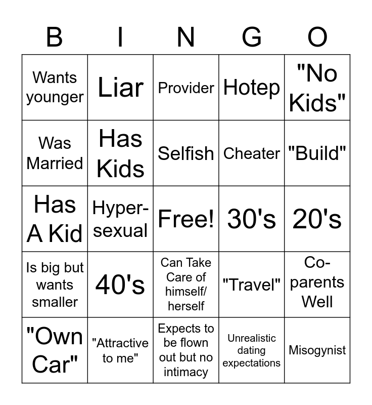 This bingo card has a free space and 40 words: Entrepreneur, Has A Kid, 6 Figures, Has Kids, "Attractive to me", Can Take Care of himself/ herself, Selfish, "God Fearing", "No Kids", Is big but wants smaller, Hyper-sexual, Hotep, Misogynist, 20's, 30's, 40's, 50+, Wants younger, City Girl, Provider, Co-parents Well, Unrealistic dating expectations, Cheater, Was Married, "50/50", Controlling, Group Therapy, Kendra Cousin, Pajamas, "Feminine", "Masculine" "Alpha" "In Charge" "Leader", "Own Car", "Own House/ Apartment", "Travel", "Build", Expects to be flown out but no intimacy, Willing to travel, Engaged, Liar and Stupid.