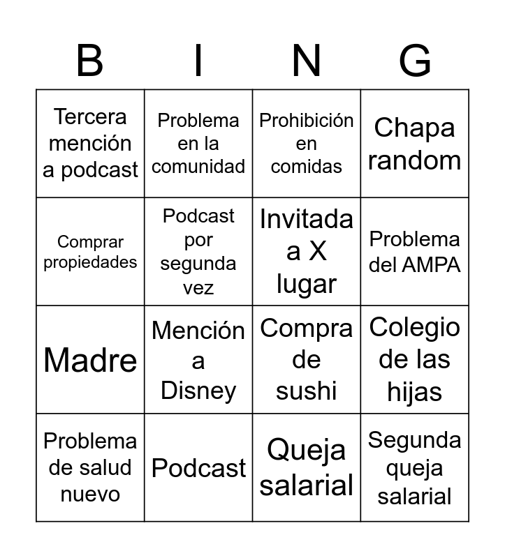 This bingo card has 16 words: Podcast, Colegio de las hijas, Prohibición en comidas, Tercera mención a podcast, Madre, Problema en la comunidad, Compra de sushi, Queja salarial, Comprar propiedades, Podcast por segunda vez, Problema de salud nuevo, Chapa random, Mención a Disney, Problema del AMPA, Invitada a X lugar and Segunda queja salarial.