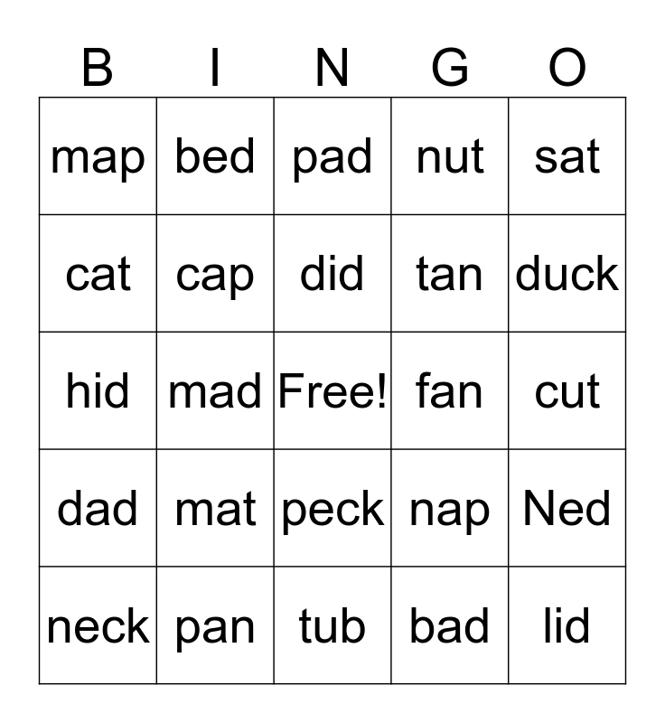 This bingo card has a free space and 24 words: mat, pan, did, neck, sat, map, cat, bed, fan, peck, tan, hid, nap, Ned, cap, bad, cut, pad, duck, mad, lid, dad, nut and tub.