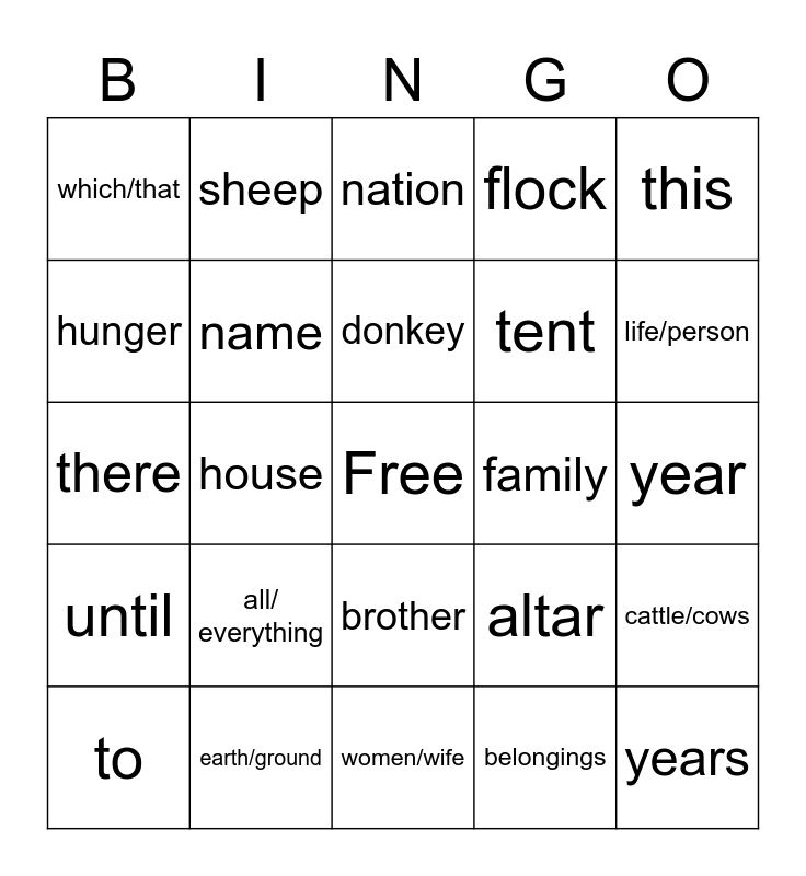 This bingo card has a free space and 29 words: to, land, house, father, which/that, nation, name, all/ everything, family, earth/ground, year, years, women/wife, belongings, life/person, son/age of, brother, until, this, there, altar, mountain, tent, hunger, flock, sheep, cattle/cows, donkey and camel.