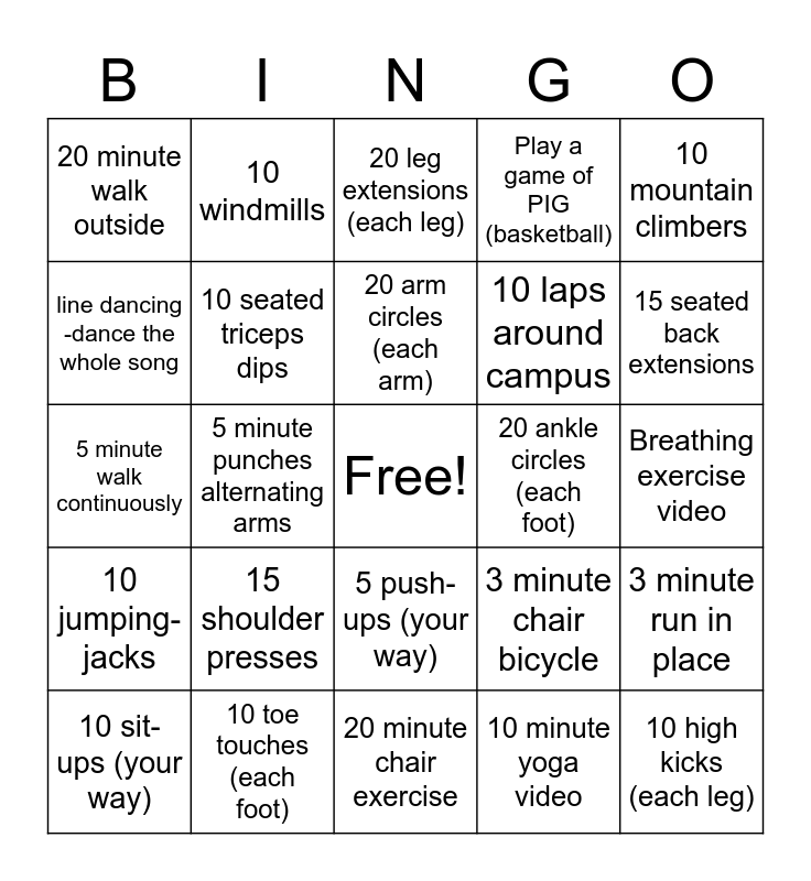 This bingo card has a free space and 24 words: 15 shoulder presses, 10 toe touches (each foot), 20 arm circles (each arm), 10 sit-ups (your way), 10 mountain climbers, 20 minute walk outside, line dancing -dance the whole song, 10 windmills, 20 ankle circles (each foot), 5 push-ups (your way), 10 laps around campus, 5 minute walk continuously, 3 minute chair bicycle, 3 minute run in place, 10 seated triceps dips, 10 minute yoga video, Breathing exercise video, 20 leg extensions (each leg), 15 seated back extensions, 5 minute punches alternating arms, 10 high kicks (each leg), 10 jumping-jacks, Play a game of PIG (basketball) and 20 minute chair exercise.