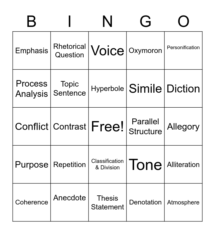 This bingo card has a free space and 24 words: Repetition, Anecdote, Hyperbole, Coherence, Personification, Emphasis, Process Analysis, Rhetorical Question, Parallel Structure, Classification & Division, Simile, Conflict, Tone, Alliteration, Topic Sentence, Denotation, Allegory, Voice, Diction, Contrast, Atmosphere, Purpose, Oxymoron and Thesis Statement.