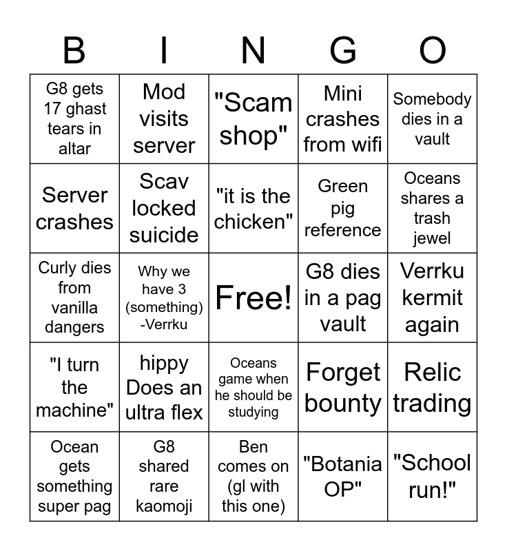This bingo card has a free space and 24 words: hippy Does an ultra flex, G8 shared rare kaomoji, "it is the chicken", Ocean gets something super pag, Somebody dies in a vault, G8 gets 17 ghast tears in altar, Server crashes, Mod visits server, G8 dies in a pag vault, Oceans game when he should be studying, Green pig reference, Curly dies from vanilla dangers, Forget bounty, Relic trading, Scav locked suicide, "Botania OP", Verrku kermit again, "Scam shop", Oceans shares a trash jewel, Why we have 3 (something) -Verrku, "School run!", "I turn the machine", Mini crashes from wifi and Ben comes on (gl with this one).