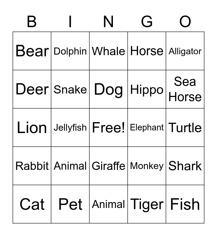 This bingo card has a free space and 24 words: Animal, Pet, Dog, Cat, Alligator, Bear, Deer, Dolphin, Elephant, Giraffe, Hippo, Lion, Monkey, Shark, Snake, Tiger, Turtle, Whale, Sea Horse, Jellyfish, Fish, Rabbit, Horse and Animal.