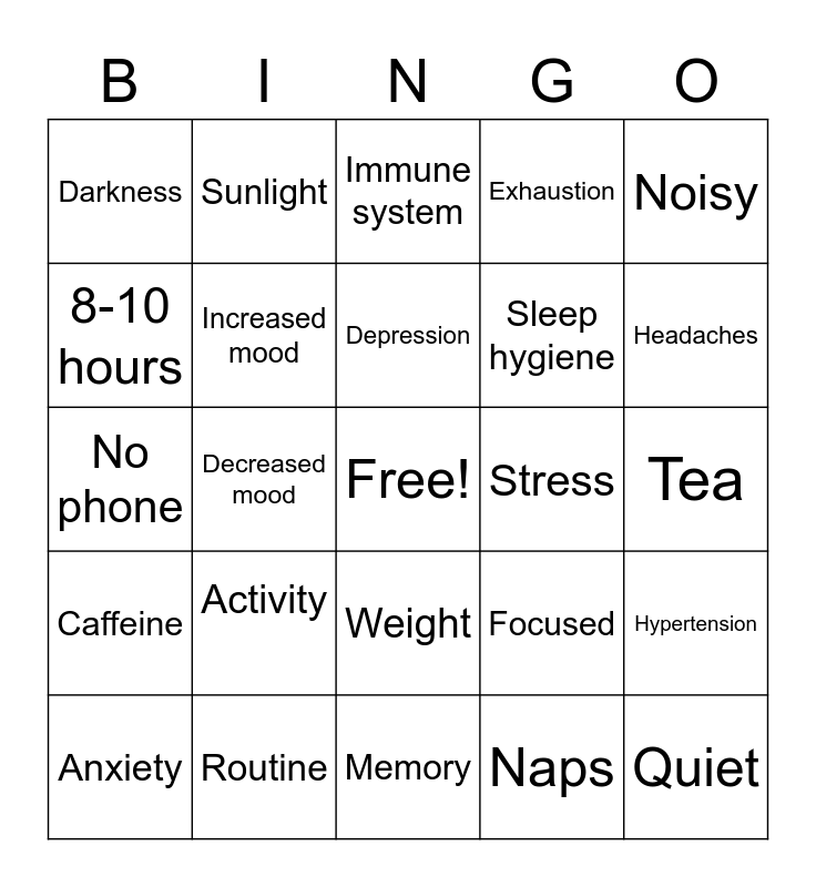 This bingo card has a free space and 24 words: Activity, Routine, Depression, Anxiety, Noisy, Darkness, 8-10 hours, Sunlight, Stress, Weight, Sleep hygiene, No phone, Focused, Hypertension, Increased mood, Naps, Tea, Immune system, Headaches, Decreased mood, Quiet, Caffeine, Exhaustion and Memory.