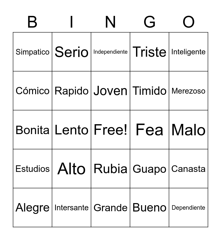 This bingo card has a free space and 24 words: Alto, Intersante, Joven, Alegre, Inteligente, Simpatico, Cómico, Serio, Fea, Rubia, Timido, Bonita, Guapo, Canasta, Rapido, Bueno, Malo, Independiente, Merezoso, Lento, Dependiente, Estudios, Triste and Grande.