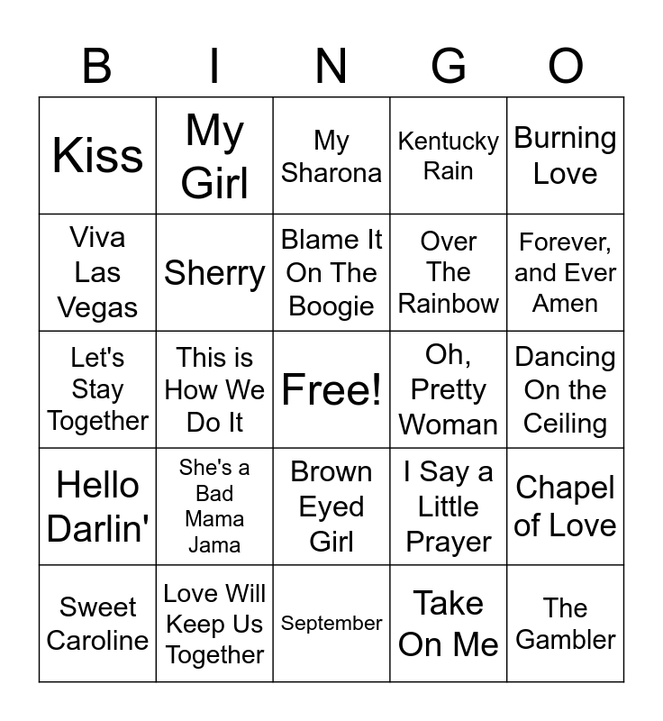 This bingo card has a free space and 24 words: She's a Bad Mama Jama, Love Will Keep Us Together, Blame It On The Boogie, Sweet Caroline, Burning Love, Kiss, Viva Las Vegas, My Girl, Oh, Pretty Woman, Brown Eyed Girl, Over The Rainbow, Let's Stay Together, I Say a Little Prayer, Chapel of Love, Sherry, Take On Me, Dancing On the Ceiling, My Sharona, Forever, and Ever Amen, This is How We Do It, The Gambler, Hello Darlin', Kentucky Rain and September.