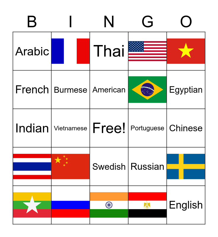 This bingo card has 11 images, a free space and 13 words: American, Arabic, French, Portuguese, Swedish, Indian, Russian, Burmese, Chinese, Thai, Egyptian, Vietnamese and English.