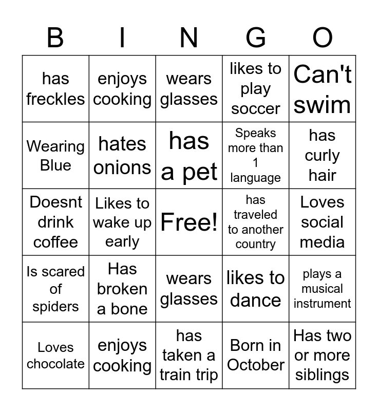 This bingo card has a free space and 29 words: Wearing Blue, enjoys cooking, wears glasses, likes to play soccer, Can't swim, has freckles, hates onions, has a pet, has traveled to another country, plays a musical instrument, Loves chocolate, Likes to wake up early, Born in October, Has two or more siblings, Doesnt drink coffee, Is left handed, has taken a train trip, likes to dance, has curly hair, Is scared of spiders, Has broken a bone, Has a library card, Speaks more than 1 language, Loves social media, Wearing Blue, enjoys cooking, wears glasses, likes to play soccer and Can't swim.