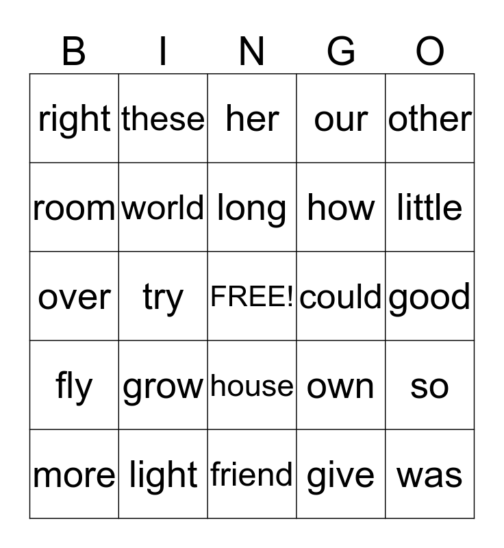 This bingo card has a free space and 24 words: grow, light, long, more, other, right, room, these, could, house, how, over, own, so, world, give, good, her, little, try, was, fly, our and friend.