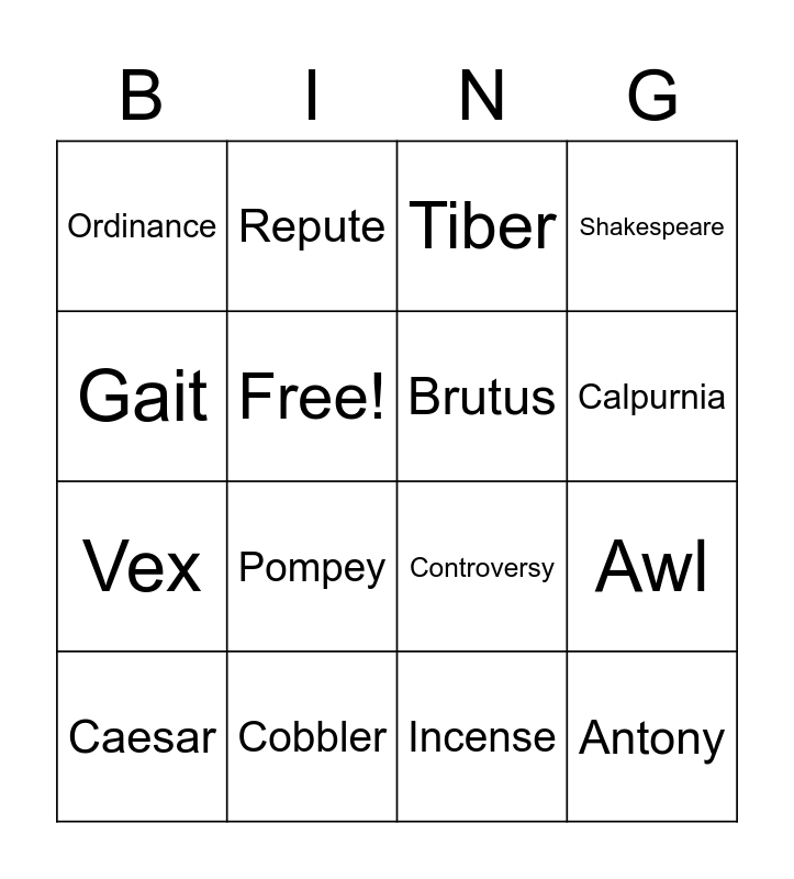 This bingo card has 16 words: Cobbler, Awl, Tiber, Ordinance, Vex, Repute, Controversy, Incense, Gait, Free!, Caesar, Shakespeare, Pompey, Calpurnia, Brutus and Antony.