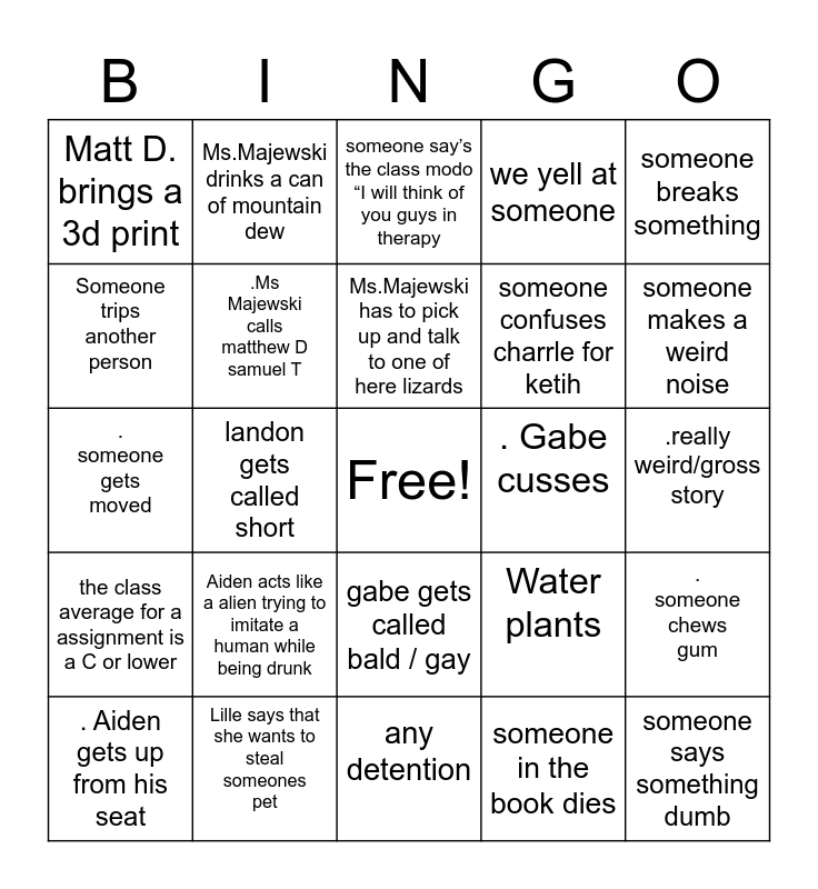 This bingo card has a free space and 24 words: . Aiden gets up from his seat, Aiden acts like a alien trying to imitate a human while being drunk, Ms.Majewski has to pick up and talk to one of here lizards, someone in the book dies, someone breaks something, Matt D. brings a 3d print, Ms.Majewski drinks a can of mountain dew, someone say’s the class modo “I will think of you guys in therapy, . Gabe cusses, .really weird/gross story, . someone gets moved, .Ms Majewski calls matthew D samuel T, Water plants, . someone chews gum, Someone trips another person, Lille says that she wants to steal someones pet, any detention, we yell at someone, someone makes a weird noise, the class average for a assignment is a C or lower, landon gets called short, gabe gets called bald / gay, someone confuses charrle for ketih and someone says something dumb.