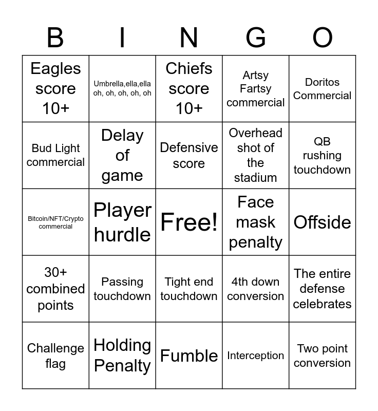 This bingo card has a free space and 29 words: Challenge flag, Special teams touchdown, Player hurdle, Mahomes sacked, Eagles score 10+, Chiefs score 10+, Delay of game, Passing touchdown, Face mask penalty, Holding Penalty, Offside, Two point conversion, Fumble, Interception, QB rushing touchdown, Trick play, Tight end touchdown, 30+ combined points, Doritos Commercial, Bitcoin/NFT/Crypto commercial, 4th down conversion, Quarterback looking pensive during the national anthem, Overhead shot of the stadium, Bud Light commercial, Artsy Fartsy commercial, Umbrella,ella,ella oh, oh, oh, oh, oh, The entire defense celebrates, Defensive score and Celebrity in crowd.
