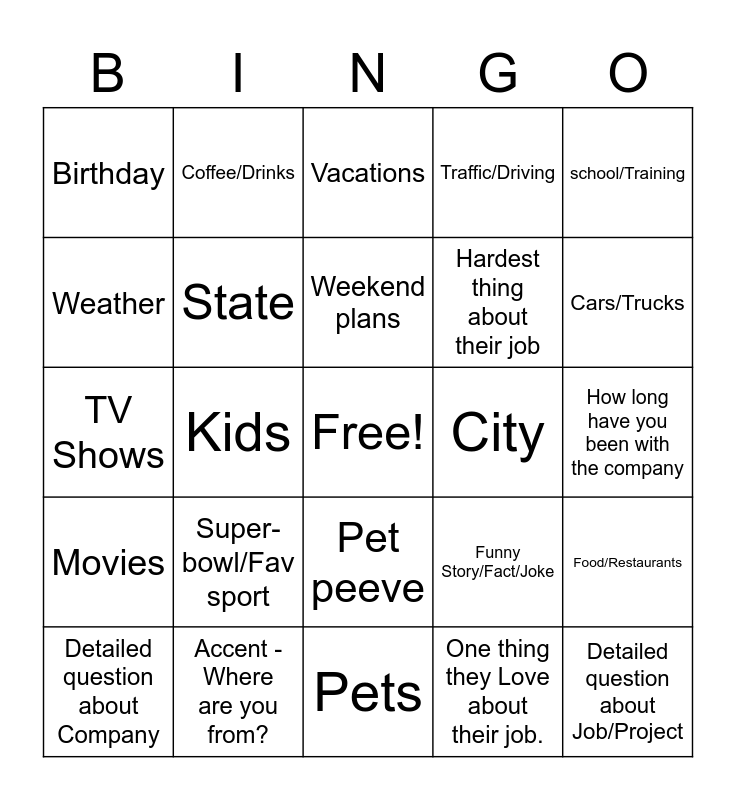 This bingo card has a free space and 24 words: Super-bowl/Fav sport, Accent -Where are you from?, Weekend plans, Detailed question about Company, school/Training, Birthday, Weather, Coffee/Drinks, City, Pet peeve, Hardest thing about their job, TV Shows, Funny Story/Fact/Joke, Food/Restaurants, State, One thing they Love about their job., How long have you been with the company, Vacations, Cars/Trucks, Kids, Detailed question about Job/Project, Movies, Traffic/Driving and Pets.