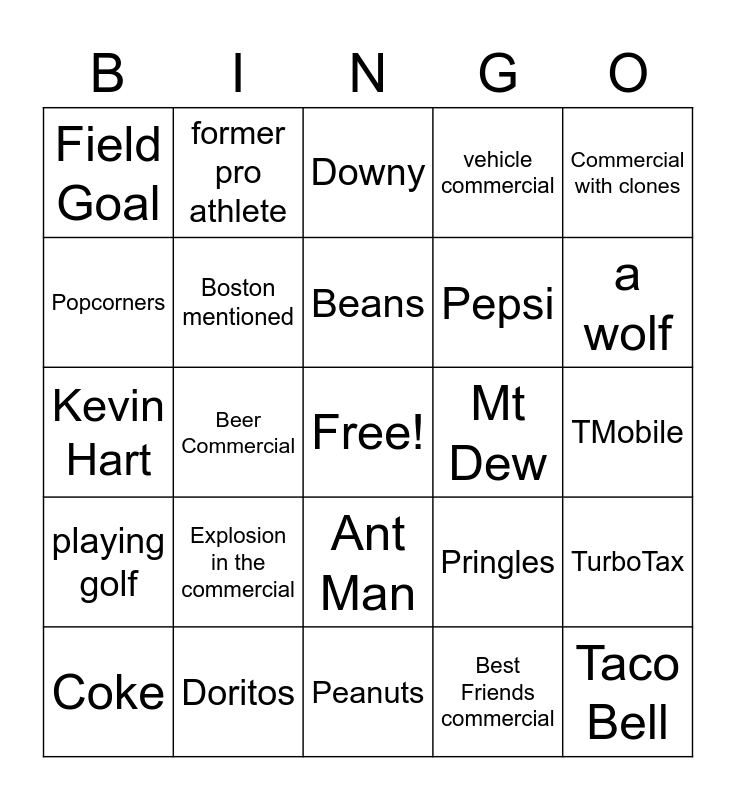 This bingo card has a free space and 29 words: Coke, Grease Musical Spoof, Beer Commercial, Avocado, Field Goal, Downy, Boston mentioned, Explosion in the commercial, Mt Dew, Doritos, TMobile, Taco Bell, Peanuts, Best Friends commercial, a wolf, M&M's, Ant Man, playing golf, Commercial with clones, Kevin Hart, Pringles, Google Phones, Pepsi, Popcorners, vehicle commercial, former pro athlete, TurboTax, Beans and Rakuten.