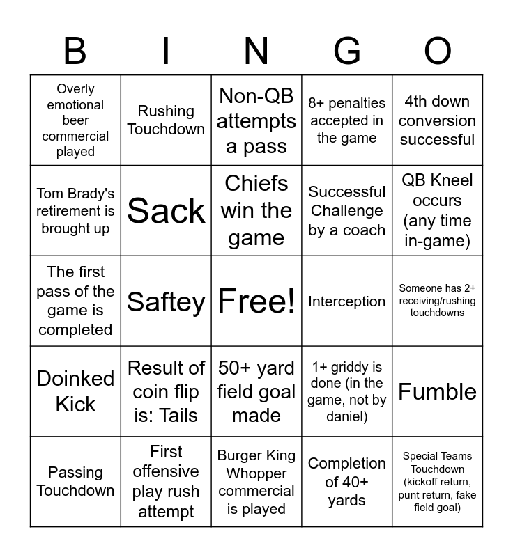 This bingo card has a free space and 24 words: Result of coin flip is: Tails, First offensive play rush attempt, Chiefs win the game, Passing Touchdown, 4th down conversion successful, Overly emotional beer commercial played, Tom Brady's retirement is brought up, Rushing Touchdown, Interception, 50+ yard field goal made, Successful Challenge by a coach, The first pass of the game is completed, 1+ griddy is done (in the game, not by daniel), Fumble, Sack, Completion of 40+ yards, Someone has 2+ receiving/rushing touchdowns, Non-QB attempts a pass, QB Kneel occurs (any time in-game), Saftey, Special Teams Touchdown (kickoff return, punt return, fake field goal), Doinked Kick, 8+ penalties accepted in the game and Burger King Whopper commercial is played.