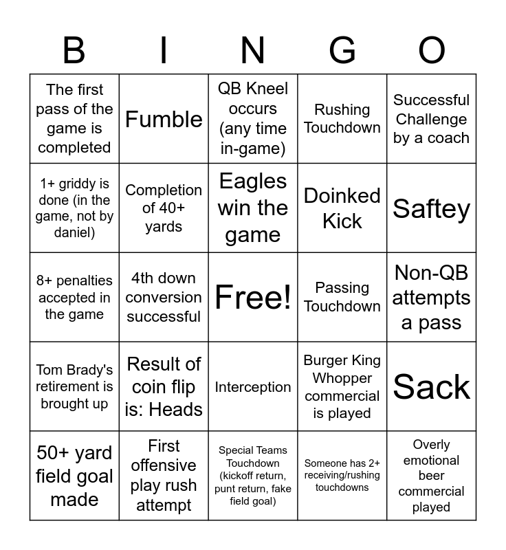 This bingo card has a free space and 24 words: Result of coin flip is: Heads, First offensive play rush attempt, Eagles win the game, 50+ yard field goal made, Successful Challenge by a coach, The first pass of the game is completed, 1+ griddy is done (in the game, not by daniel), Fumble, Passing Touchdown, Interception, Doinked Kick, 8+ penalties accepted in the game, Burger King Whopper commercial is played, Sack, Completion of 40+ yards, Someone has 2+ receiving/rushing touchdowns, Non-QB attempts a pass, QB Kneel occurs (any time in-game), Saftey, 4th down conversion successful, Overly emotional beer commercial played, Tom Brady's retirement is brought up, Rushing Touchdown and Special Teams Touchdown (kickoff return, punt return, fake field goal).