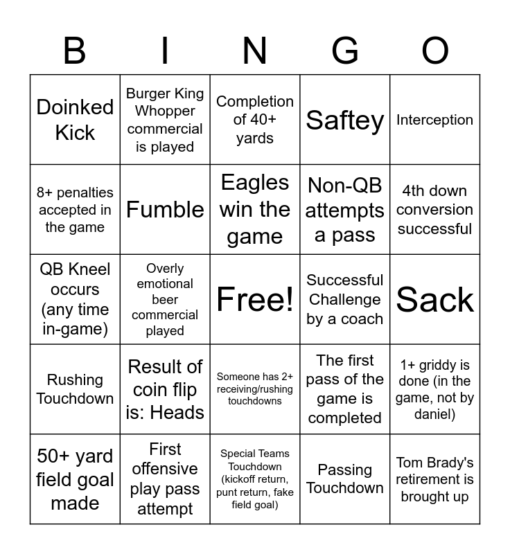 This bingo card has a free space and 24 words: Result of coin flip is: Heads, First offensive play pass attempt, Eagles win the game, 50+ yard field goal made, Interception, Doinked Kick, 8+ penalties accepted in the game, Burger King Whopper commercial is played, Successful Challenge by a coach, Someone has 2+ receiving/rushing touchdowns, Non-QB attempts a pass, QB Kneel occurs (any time in-game), The first pass of the game is completed, 1+ griddy is done (in the game, not by daniel), Fumble, Passing Touchdown, Sack, Completion of 40+ yards, 4th down conversion successful, Overly emotional beer commercial played, Tom Brady's retirement is brought up, Rushing Touchdown, Saftey and Special Teams Touchdown (kickoff return, punt return, fake field goal).