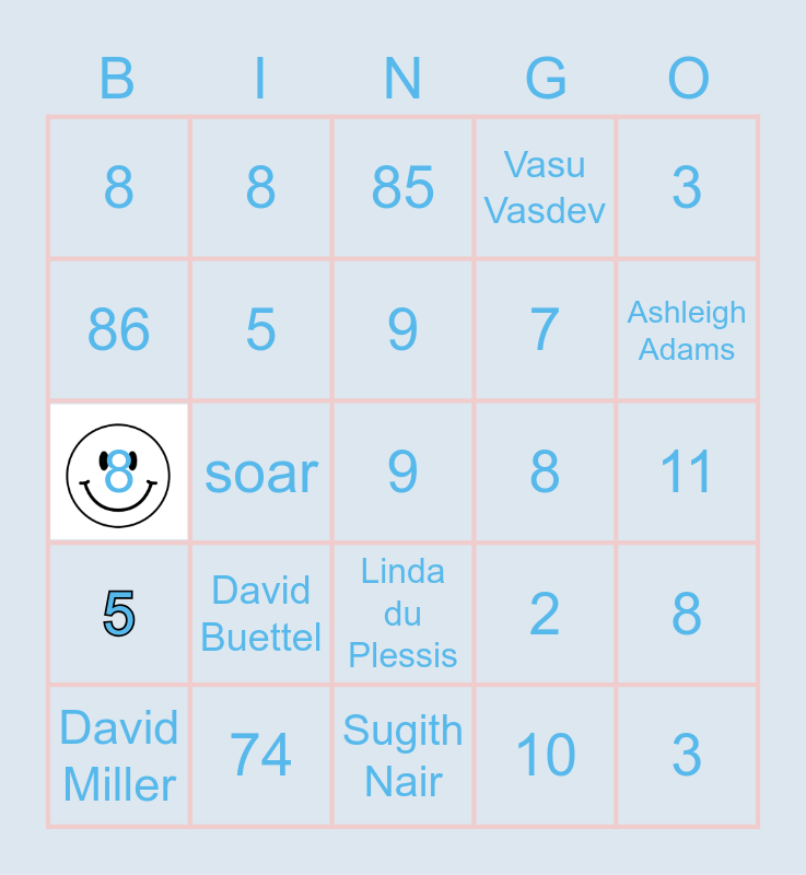 This bingo card has 2 images and 40 words: 8, soar, 1, 2, 3, 8, 5, 5, 7, 8, 8, 8, 9, 10, 11, 86, 7, 85, 22, 3, 5, 74, 9, 8, 66, ROD, ROD, ROD, ROD, ROD, Cole Jefferson-Reynolds, David Buettel, Linda du Plessis, Stephanie Canellis, Ashleigh Adams, David Miller, Jaz Canino, Sugith Nair, Vasu Vasdev and Paul Yogaraja Somu.