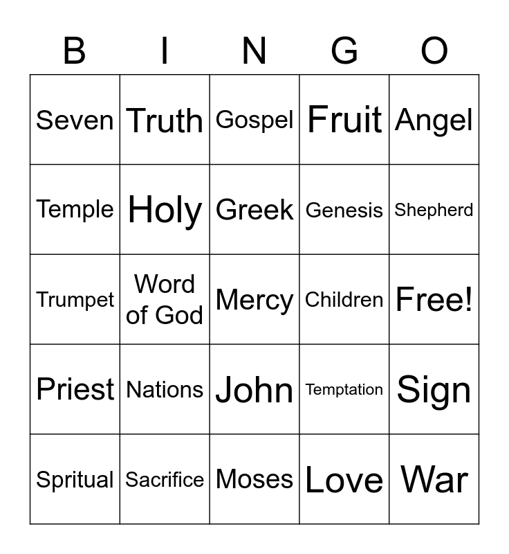 This bingo card has 68 words: Grace, Mercy, Glory, Chosen, Messiah, Life, Truth, Hebrew, Greek, Purpose, John, Throne, Free!, Angel, Worship, Temple, Word of God, Seven, Forty, Nations, Genesis, Temptation, Priest, War, King, Parable, Israel, Savior, Sign, Kingdom, Gospel, Cross, Darkness, Light, Fruit, Abraham, David, Spritual, Shepherd, Trumpet, Door, Saint, Holy, Torah, Church, Water, Blood, Sheep, Children, Sacrifice, Father, Satan, Holy Spirit, Moses, Hope, Jesus, Love, Wisdom, Prayer, Fear, Faith, Disciple, Idol, Heaven, Prophet, Bread, Sin and Peter.