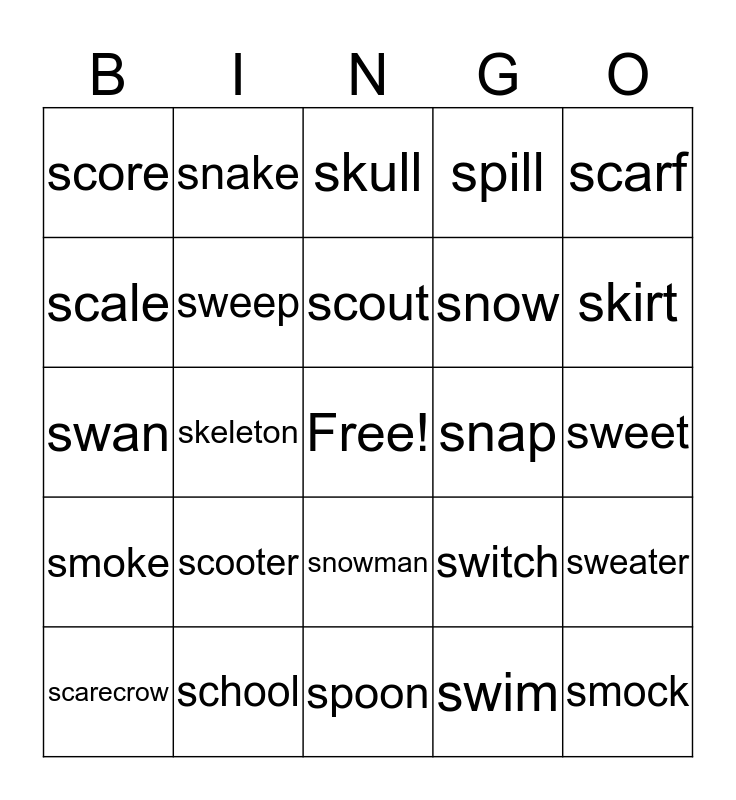 This bingo card has a free space and 24 words: scooter, school, scout, scarecrow, scarf, score, scale, snake, snap, snowman, snow, swan, switch, sweater, sweep, swim, sweet, skull, skirt, skeleton, smock, smoke, spill and spoon.