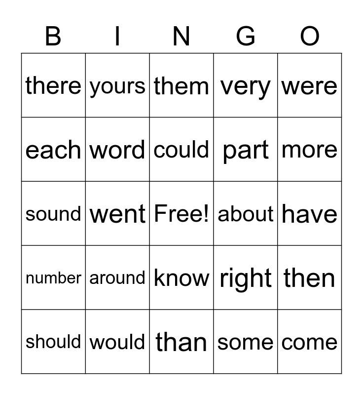 This bingo card has a free space and 24 words: around, would, could, should, were, there, each, yours, about, know, part, sound, right, then, word, some, have, them, more, went, come, number, very and than.