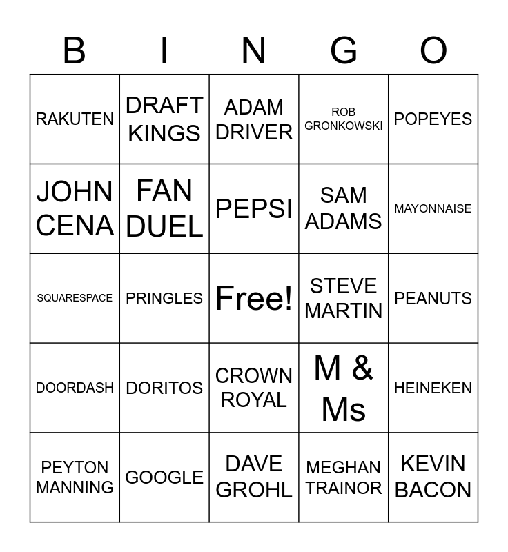 This bingo card has a free space and 46 words: BUDWEISER, KEVIN BACON, BUSCH, DAVE GROHL, DORITOS, DOWNY, DRAFT KINGS, DUNKIN', JOHN CENA, EXPERIAN, FAN DUEL, ROB GRONKOWSKI, HEINEKEN, M & Ms, MICHELOB, OIKOS, PEPSI, STEVE MARTIN, BEN STILLER, POPEYES, PRINGLES, MEGHAN TRAINOR, RAKUTEN, SAM ADAMS, OZZY OSBOURNE, MAYONNAISE, PEYTON MANNING, BEANS, CROWN ROYAL, DOORDASH, BABY, ETRADE, PEACOCK, BOOKING.COM, PRICELINE, GOOGLE, PEANUTS, UBER, BREAKING BAD, WORKDAY, REMY MARTIN, ADAM DRIVER, SQUARESPACE, TUBI, JESUS and KIA.