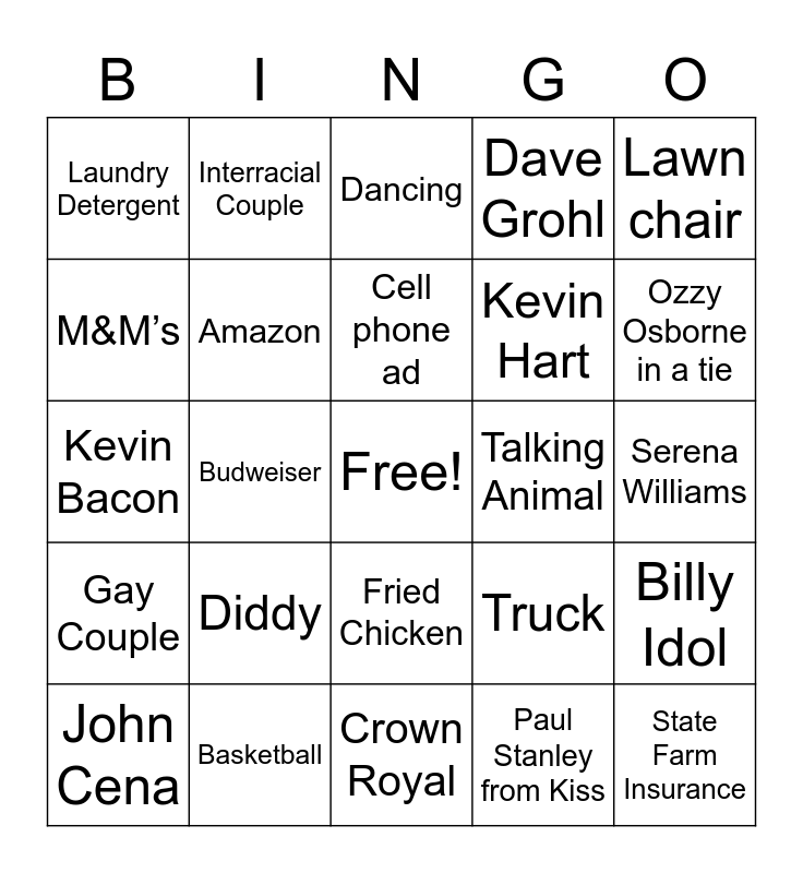 This bingo card has a free space and 44 words: Peyton Manning, State Farm Insurance, Doritos, John Cena, Movie Trailer, Paul Stanley from Kiss, Dancing, Caddy Shack reference, Lawn chair, Basketball, Dave Grohl, Talking Animal, Fried Chicken, Diddy, Avocados, Crown Royal, Heineken, Kevin Bacon, Gambling Website, Ozzy Osborne in a tie, Interracial Couple, Tailgating Party, Clydesdale Horse, Laundry Detergent, Rob Gronkowski, Serena Williams, Uber, Fed Ex, Truck, Gay Couple, Newspaper, Billy Idol, Pizza, Soft drink, Budweiser, Marvel Superhero, Grandma, Golf club, Cell phone ad, M&M’s, Kevin Hart, Someone texting, Amazon and Family eating dinner.