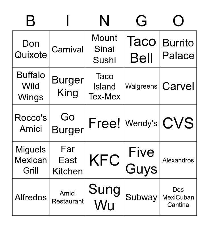 This bingo card has a free space and 35 words: Applebee's, Friendly's, Mc Donald's, Burger King, KFC, Taco Bell, Buffalo Wild Wings, Papa Johns, Taco Island Tex-Mex, Osaka, Rocco's Amici, Burrito Palace, Wasabi Steak House, Senor Taco, Don Quixote, Wendy's, Subway, Go Burger, Miguels Mexican Grill, Dos MexiCuban Cantina, Five Guys, Alfredos, Alexandros, Amici Restaurant, Mount Sinai Sushi, Carvel, Baskin Robins, 711, Walgreens, CVS, Yummy Kitchen, Sung Wu, Far East Kitchen, Carnival and Fusilli.
