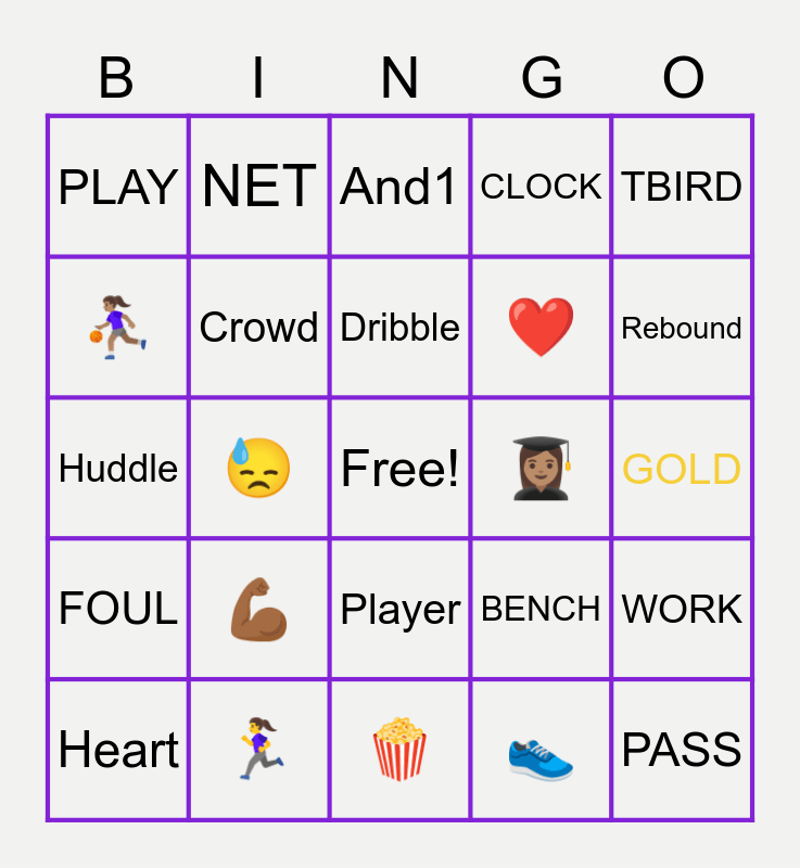 This bingo card has a free space and 68 words: HOOP, PASS, TEAM, WEST, BALL, BASKET, NET, 3pt, Dribble, Coach, Player, PURPLE, GOLD, TBIRD, 🏀, ⛹🏽♀️, 😓, PLAY, 👏🏾, 💪🏾, ❤️, BENCH, FOUL, LADIES, 📣, Jump, 😬, 👍🏾, WORK, Practice, And1, Defend, 🏆, 👀, CLOCK, 💯, GAME, Heart, Rebound, Huddle, SHOT, Finish, Crowd, SCORE, 🥇, WIN, SPORT, 📚, 👩🏽🎓, 🏃♀️, ⭐️, CHEER, TECH, 🍿, 💜, 💛, 👟, 🎒, 🔥, BUCKET, SQUAD, BIRDS, POWER, STEAL, BLOCK, POST, GUARD and WING.