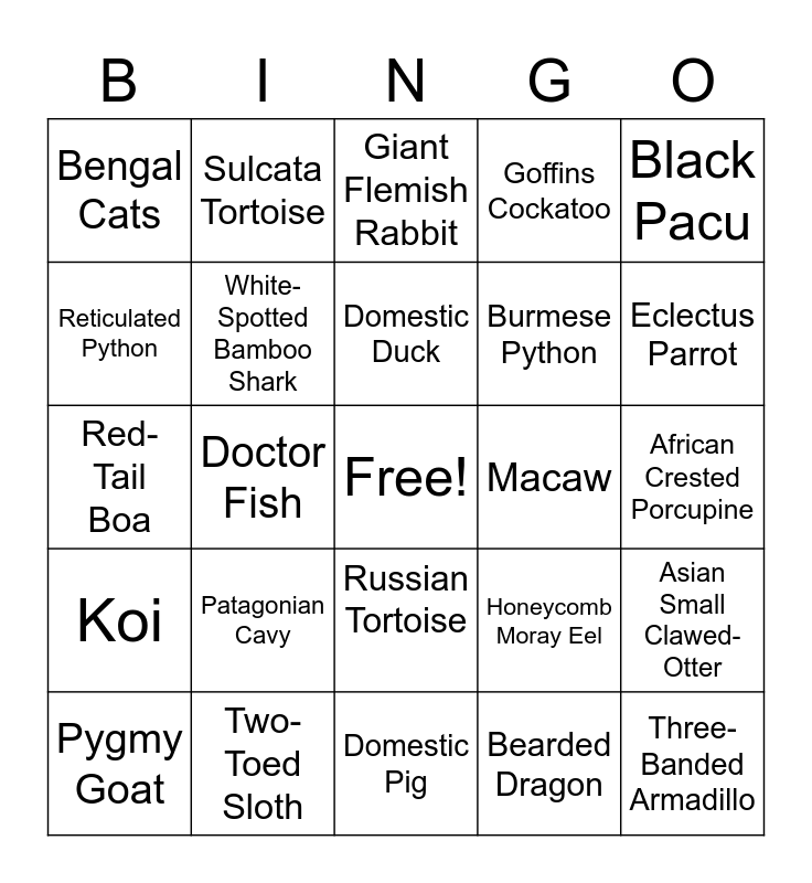 This bingo card has a free space and 36 words: Trigger Fish, California Round ray, Grey Smooth Hound Shark, White-Spotted Bamboo Shark, Honeycomb Moray Eel, Koi, Domestic Duck, Yellow-Belly Slider, Black Pacu, Red-Tailed Catfish, Doctor Fish, Goffins Cockatoo, Parakeet, Macaw, Eclectus Parrot, Bengal Cats, Prairie Dog, Patagonian Cavy, Three- Banded Armadillo, Giant Flemish Rabbit, African Crested Porcupine, Asian Small Clawed-Otter, Two-Toed Sloth, Pygmy Goat, Domestic Pig, Sulcata Tortoise, Red-Tail Boa, Ball Python, Burmese Python, Reticulated Python, Green Iguana, Black & White Tegu, Bearded Dragon, Russian Tortoise, Sulcata Tortoise and Annual Passport.