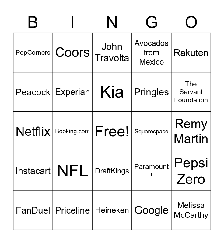 This bingo card has a free space and 56 words: Doritos, FanDuel, Downy, PopCorners, Heineken, Budweiser, Experian, Michelob Ultra, Pringles, Workaday, Avocados from Mexico, Crown Royal, Bud Light, Uber One, Busch Light, Popeyes, Rakuten, Booking.com, Hellmann's, Melissa McCarthy, Squarespace, T- Mobile, Paramount +, John Travolta, WeatherTech, Kia, FanDuel, M&Ms, The Servant Foundation, Tubi, Crown Royal, Oikos, Serena Williams, Tony Romo, Remy Martin, Peacock, Netflix, GM, Instacart, Coors, DraftKings, Miller Light, Door Dash, E*Trade, The Farmer's Dog, NFL, Priceline, e.l.f. Cosmetics, Bush's Beans, Dialpad, Google, Dunkin', Planters, TurboTax, Pepsi Zero and Dexcom.